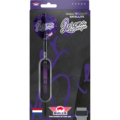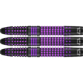 The dart features a sleek, straight barrel made from 90% tungsten, ensuring a slim profile that allows for tighter groupings and higher scores. Its grip is engineered for control and confidence, combining a shark grip with vertical incisions and an extra-aggressive rear grip, finished at the front with a micro ringed grip for added finesse. Visually striking, the black barrel is accented with vibrant purple details that mirror Lerena’s signature style.